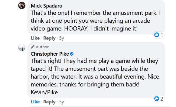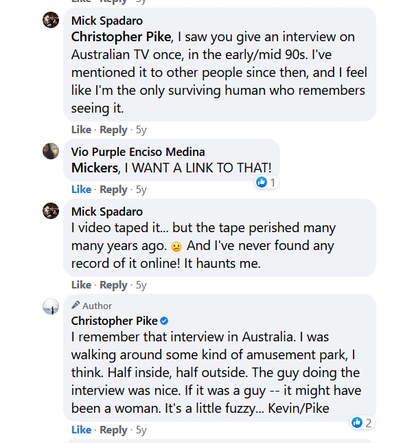 After FF [Final Friends] I sat down and wrote Remember Me, and I recall something that stunned me shortly after it came out. I used to go for runs with an old friend of mine from high school, David, and afterwards we’d go to a mall near Knotts Berry Farm to eat. It was one of those huge malls with a massive food court where you could find practically anything you were hungry for. Anyway, David and I were sitting and eating at the mall when I noticed a bunch of teenage girl sitting around our table, reading. Actually, they were mostly reading Remember Me, although a few had Weekend or Chain Letter with them. It was the first time I’d ever seen someone reading one of my books and it was an interesting experience. David went to tell the girls that I was Christopher Pike but I stopped him. I doubted they would believe him. At the same time I thought it would be more fun to tell them that I knew him, which is what I did. Of course, most of the girls thought I was just some annoying pervert. However, a few seemed to believe me, particularly when they quizzed me about the book, details about the story. Naturally, I was able to answer all their questions in exquisite detail. (Source)